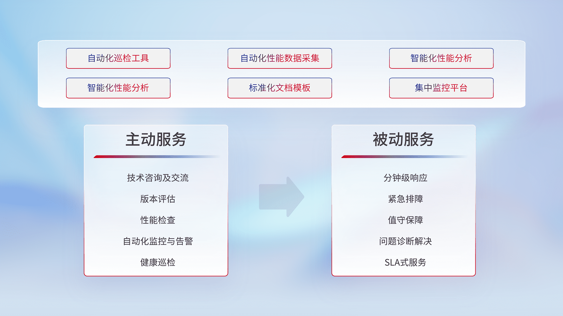 智能化工具和标准化文档,,保障服务质量,,提供主动服务(包含技术咨询、、版本评估、、、性能检查、、、、自动化监控与告警、、、、健康巡检)和被动服务包含(分钟级响应、、、紧急排障、、值守保障、、问题诊断解决、、SLA服务)。。。。